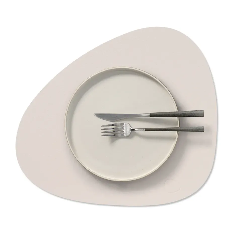 Vermijd direct zonlicht gedurende langere tijd: dit kan de structuur van het leer aantasten.Plaats het tafelblad alleen op een droge, vlakke ondergrond. Wees extra voorzichtig met geoliede tafels, omdat overtollige olie door het product kan worden opgenomenNiet weken. - Vorm: Asymmetrisch